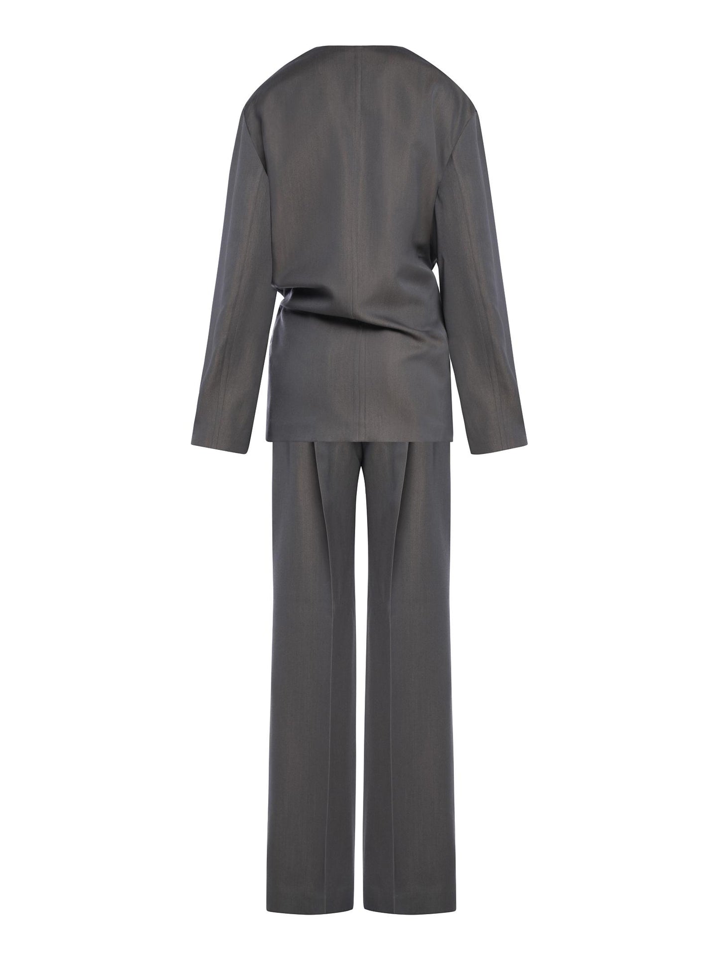 - Blazer: chiusura laterale, apertura che consente di inserire l'altro lato della giacca, offrendo la possibilità di regolarla; scollo a V incrociato; maniche lunghe, spalle morbide; dettaglio drappeggi sul davanti; orlo asimmetrico