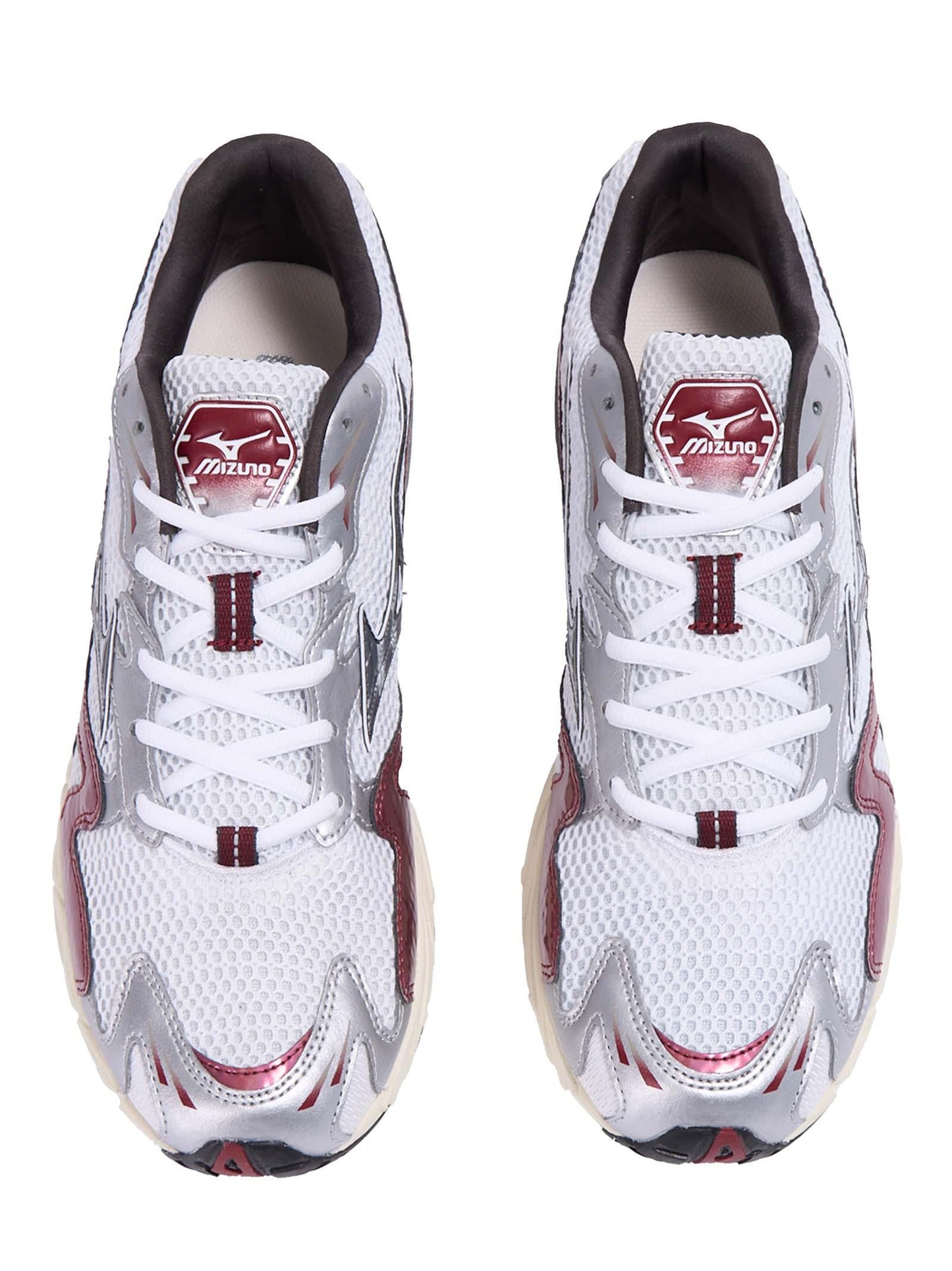 - Tomaia in mesh aperta OG, con rivestimento effetto metallizzato OG; Dettagli bordeaux e argento