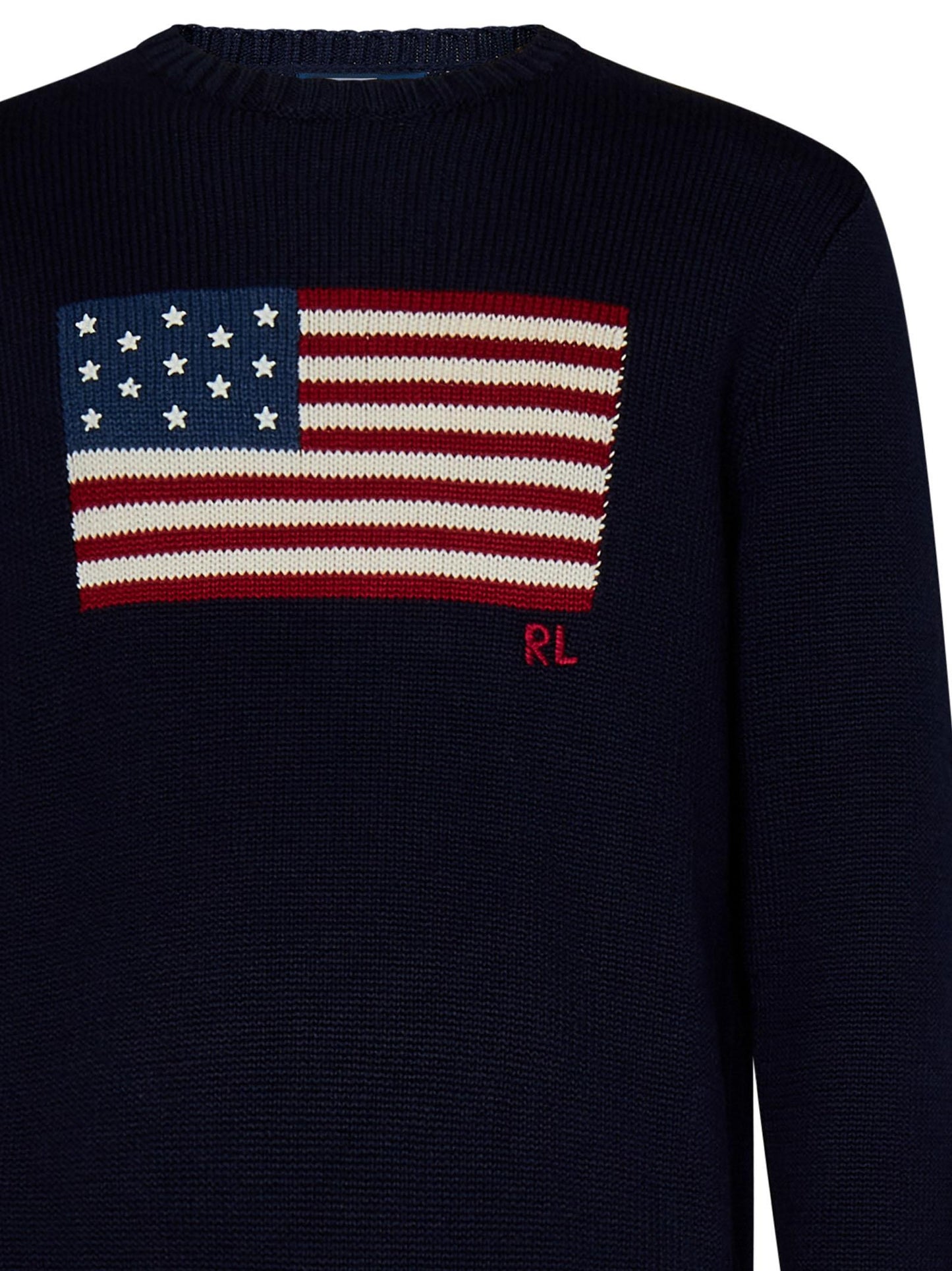 - Bandiera americana in maglia a intarsi sul davanti; stelle e monogramma "RL" ricamati sul davanti