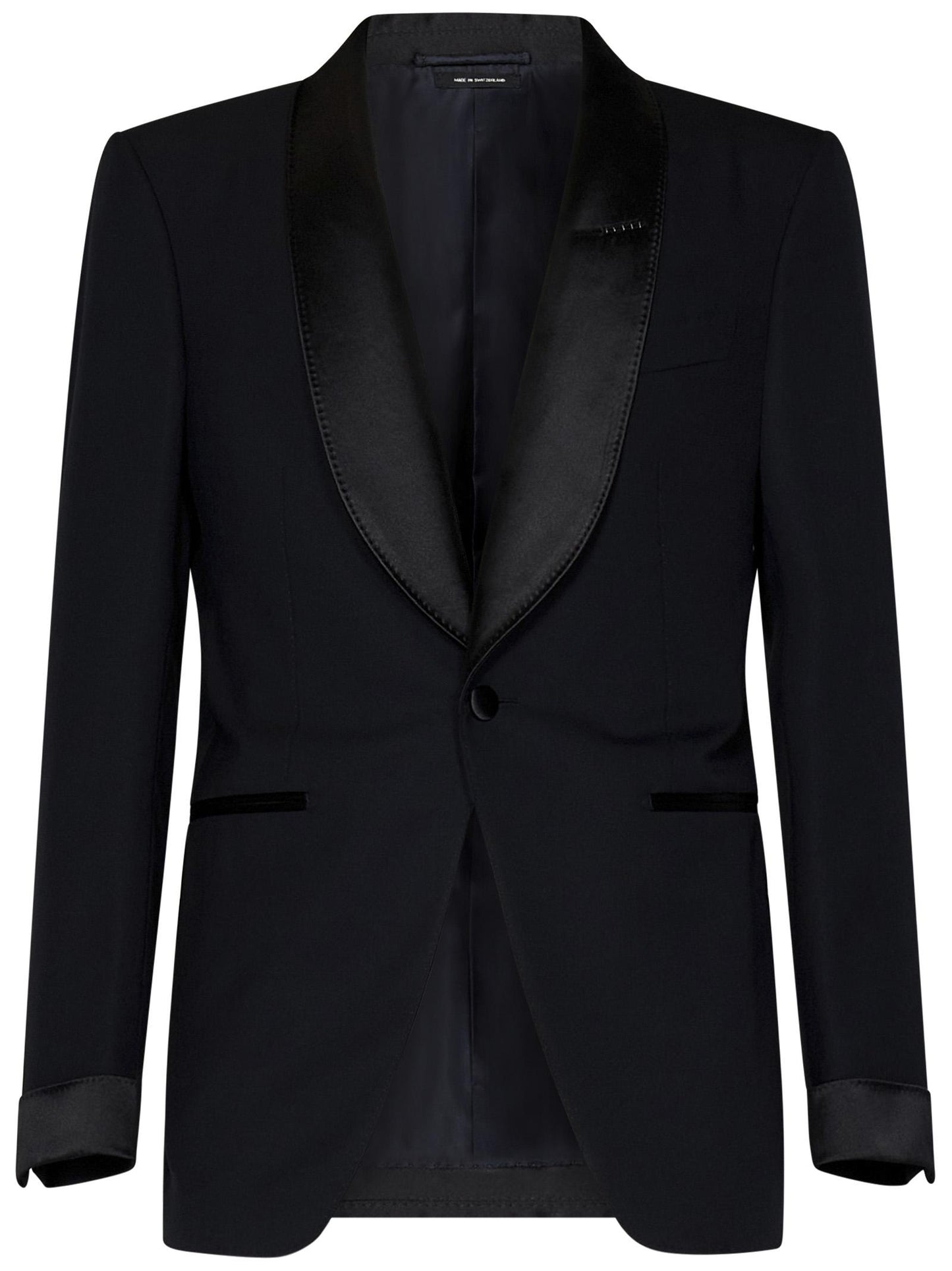- Giacca: Chiusura frontale monopetto con bottone singolo, rever sciallato in satin di seta, tasche a filetto laterali, taschino a filetto sul petto, maniche lunghe, polsi con risvolto in satin, bottoni ai polsi, spacco centrale sul retro, foderato