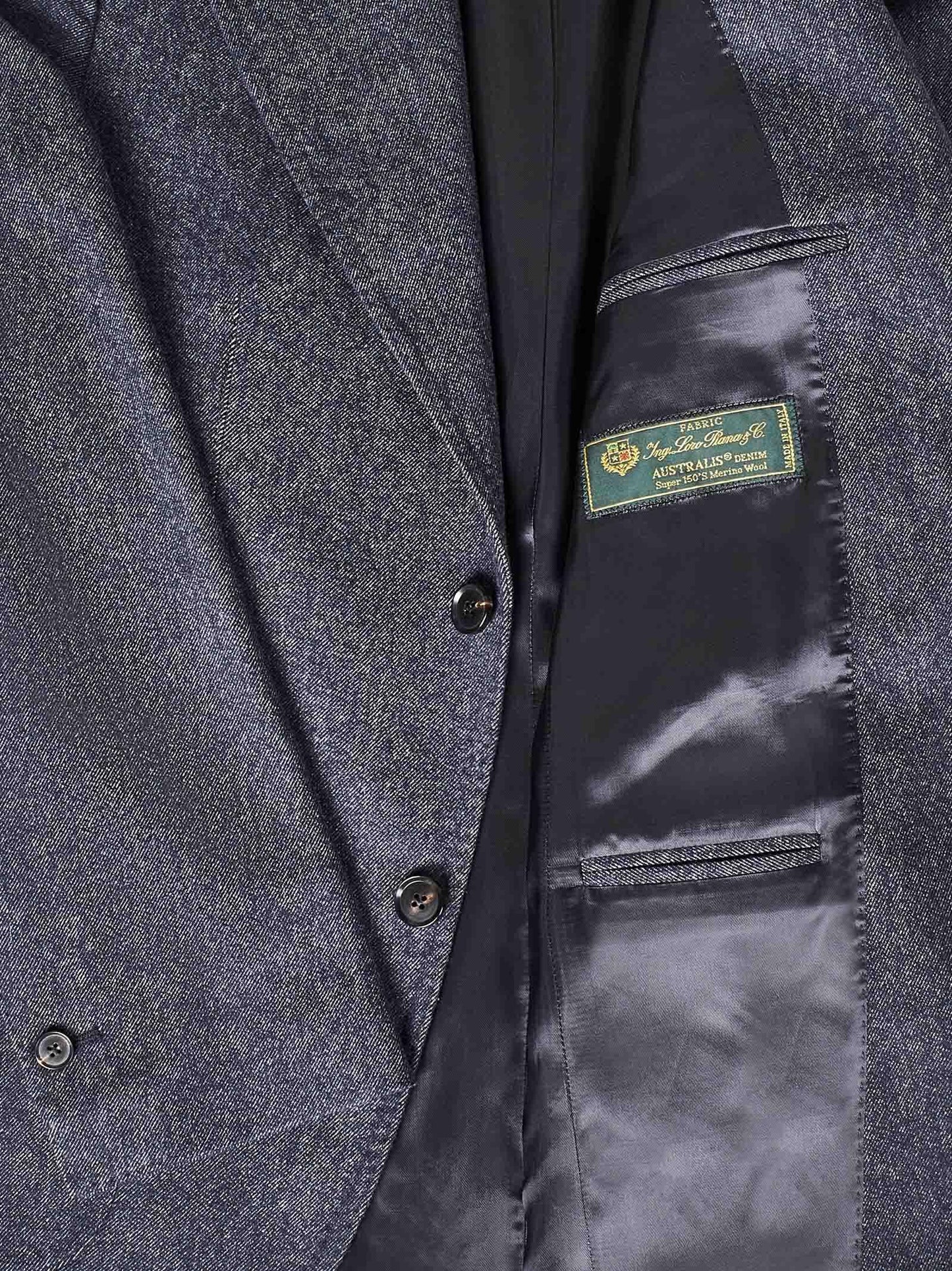 Il massimo della qualità e dell'eleganza per la giacca modello Stefano De Martino firmata Franzese Collection, realizzata in tessuto pregiatissimo Australis Denim Super 150s Merino Wool di Ing. Loro Piana & C. Pensata per regalare vibrazioni classy a tutti i look, è interamente cucita a mano e disegnata con la chiusura monopetto a due bottoni e il classico rever a lancia.