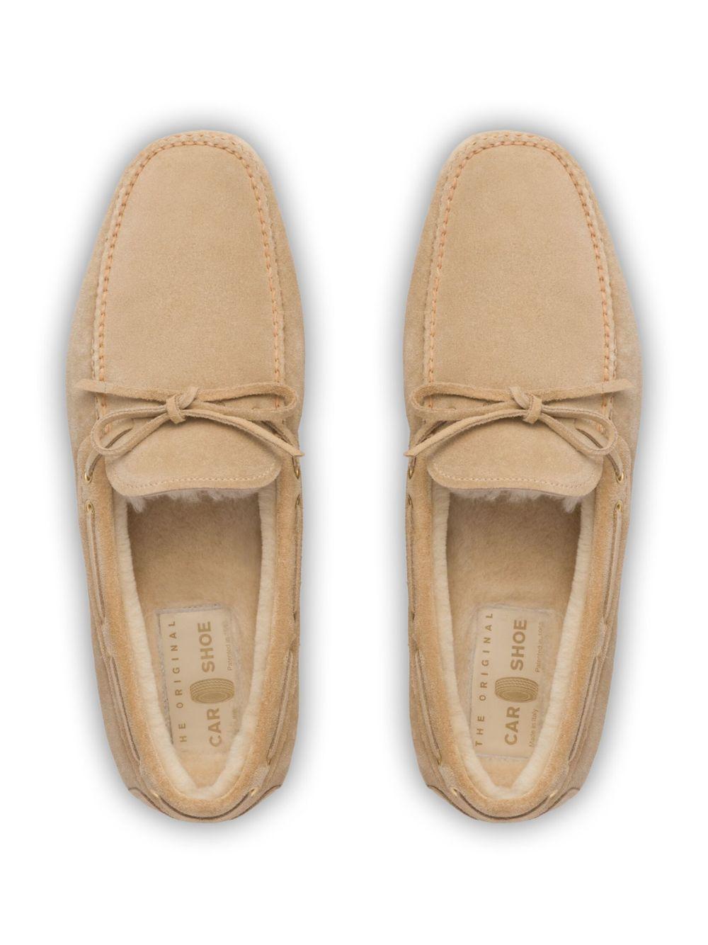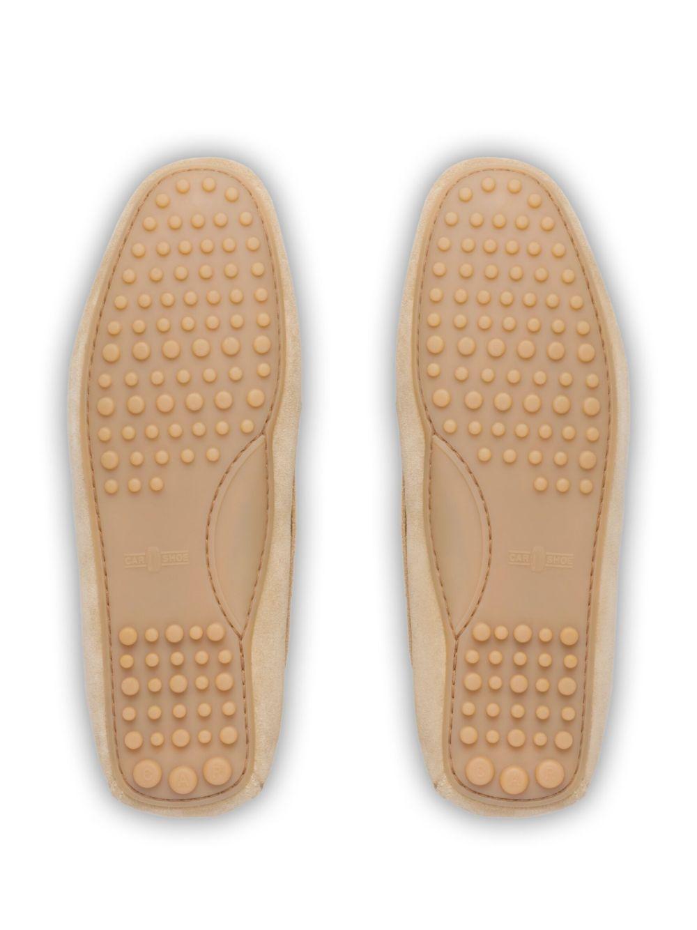 - Dettaglio fiocco in pelle scamosciata sul davanti; lacci in pelle scamosciata con passavela in metallo con finitura ottone