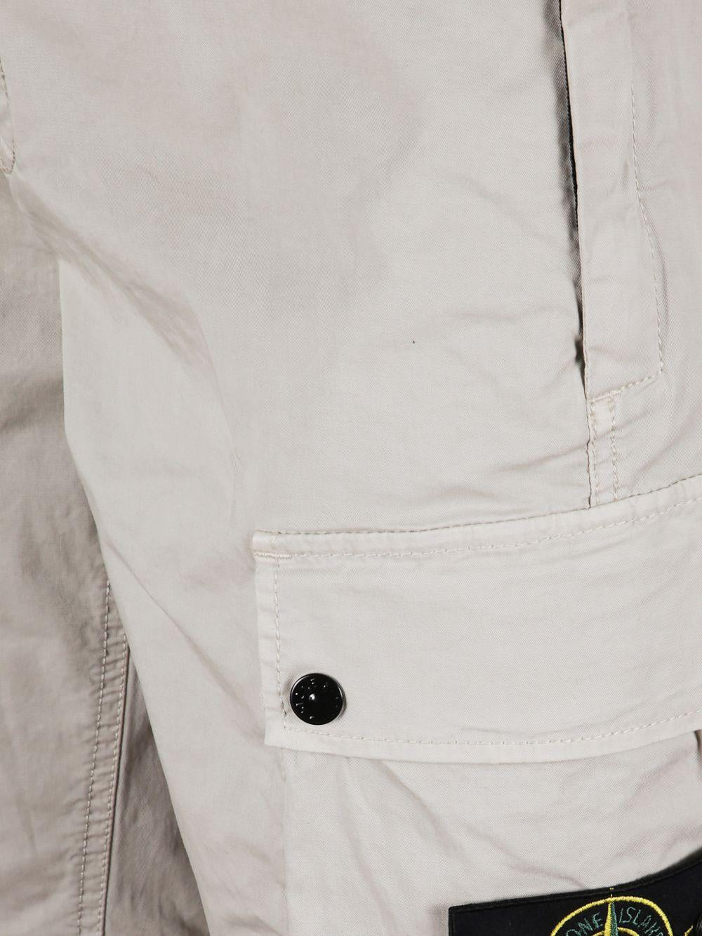 - Tasche laterali verticali con zip nascosta, tasca posteriore a filetto con bottone automatico coperto, tasche cargo a soffietto con patta e doppio bottone automatico; badge Stone Island sulla tasca cargo sinistra