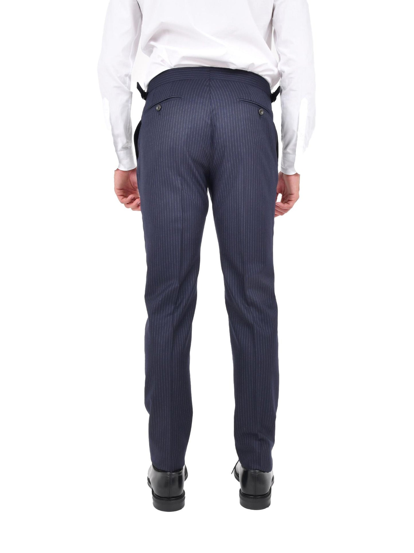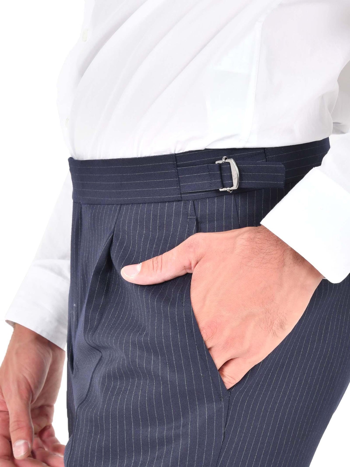 - Chiusura frontale con zip nascosta, cinturino con bottone, cinturini laterali regolabili, pinces sul davanti, tasche inserite sui lati, tasche a filetto con bottone sul retro, fondo gamba 19cm