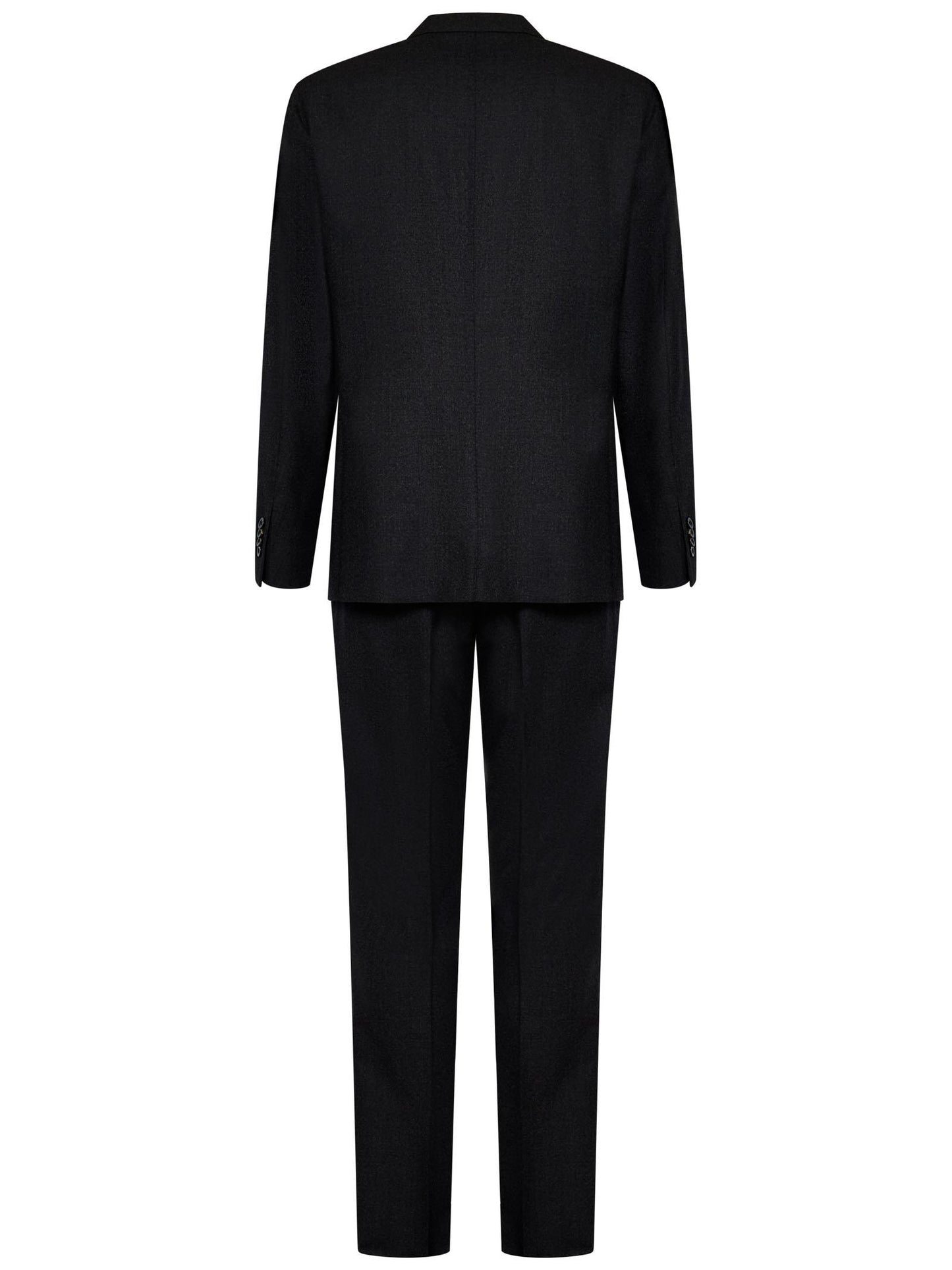 - Trousers: Front button and hidden zip fastening, belt loops at waist, two slant pockets, welt pockets at back, central pleat sewn on front and back