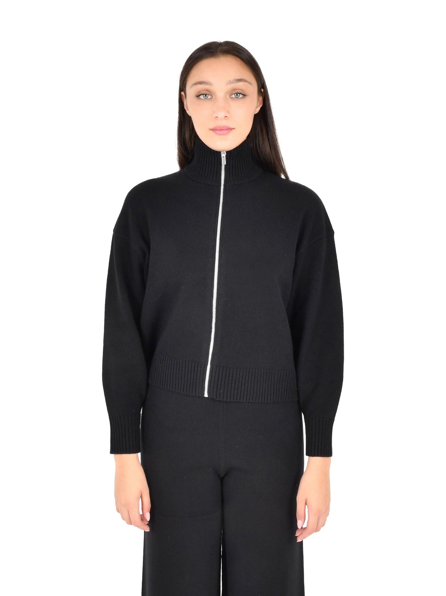 - Collo alto a coste; maniche lunghe, spalle basse