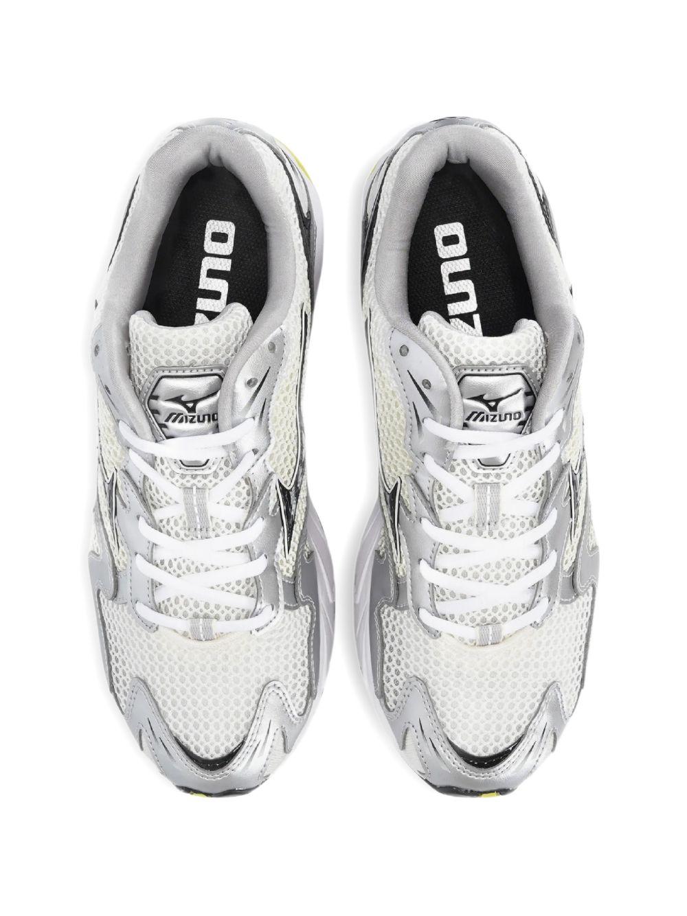 - Tomaia in mesh bianco con inserti in similpelle argento e nero, inserti in TPU